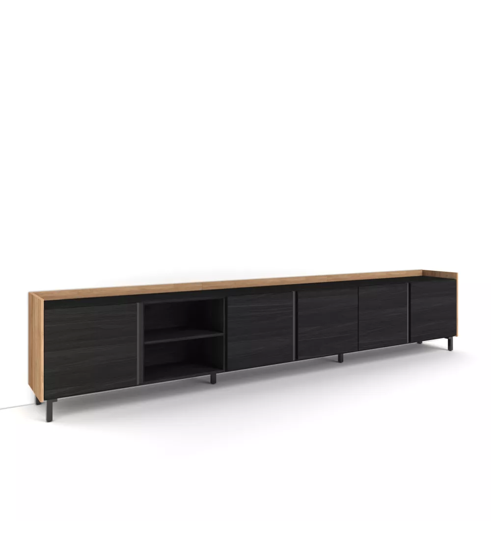 Skraut Home | Meuble TV | Banc Télé | Grand espace de Rangement | 309x61x35 cm | Pour les TV jusqu'à 80" | Design industriel | Style moderne | Noir et chêne