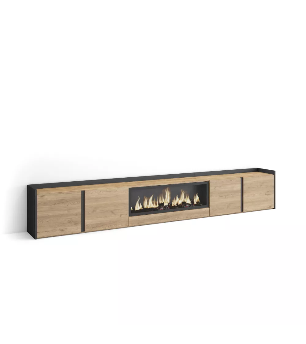 Skraut Home | Meuble TV | Banc Télé | Grand espace de Rangement | 315x50x35 cm | Pour les TV jusqu'à 80" | Cheminée électrique XXL | Style moderne | Chêne et noir