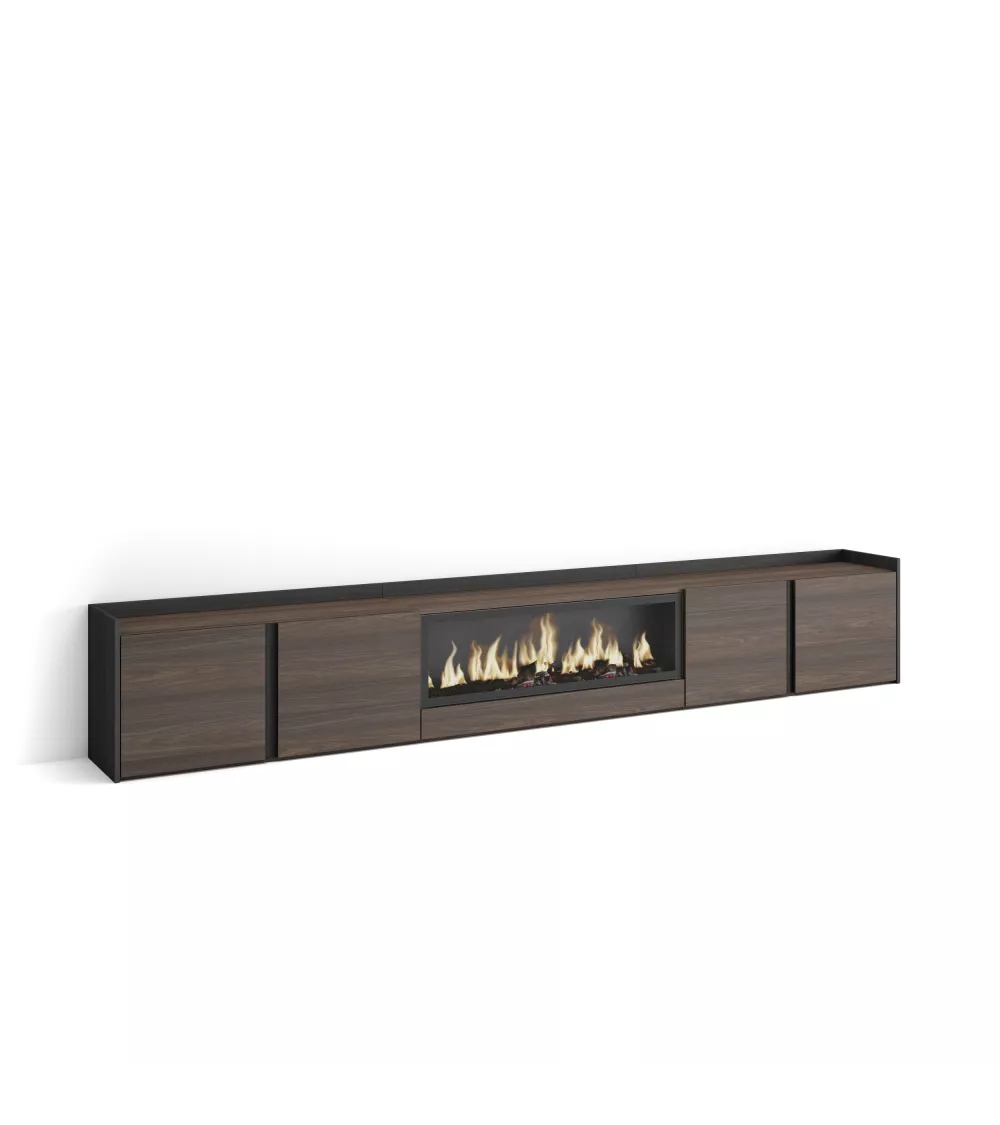 Skraut Home | Meuble TV | Banc Télé | Grand espace de Rangement | 315x50x35 cm | Pour les TV jusqu'à 80" | Cheminée électrique XXL | Style moderne | Chêne foncé et Noir