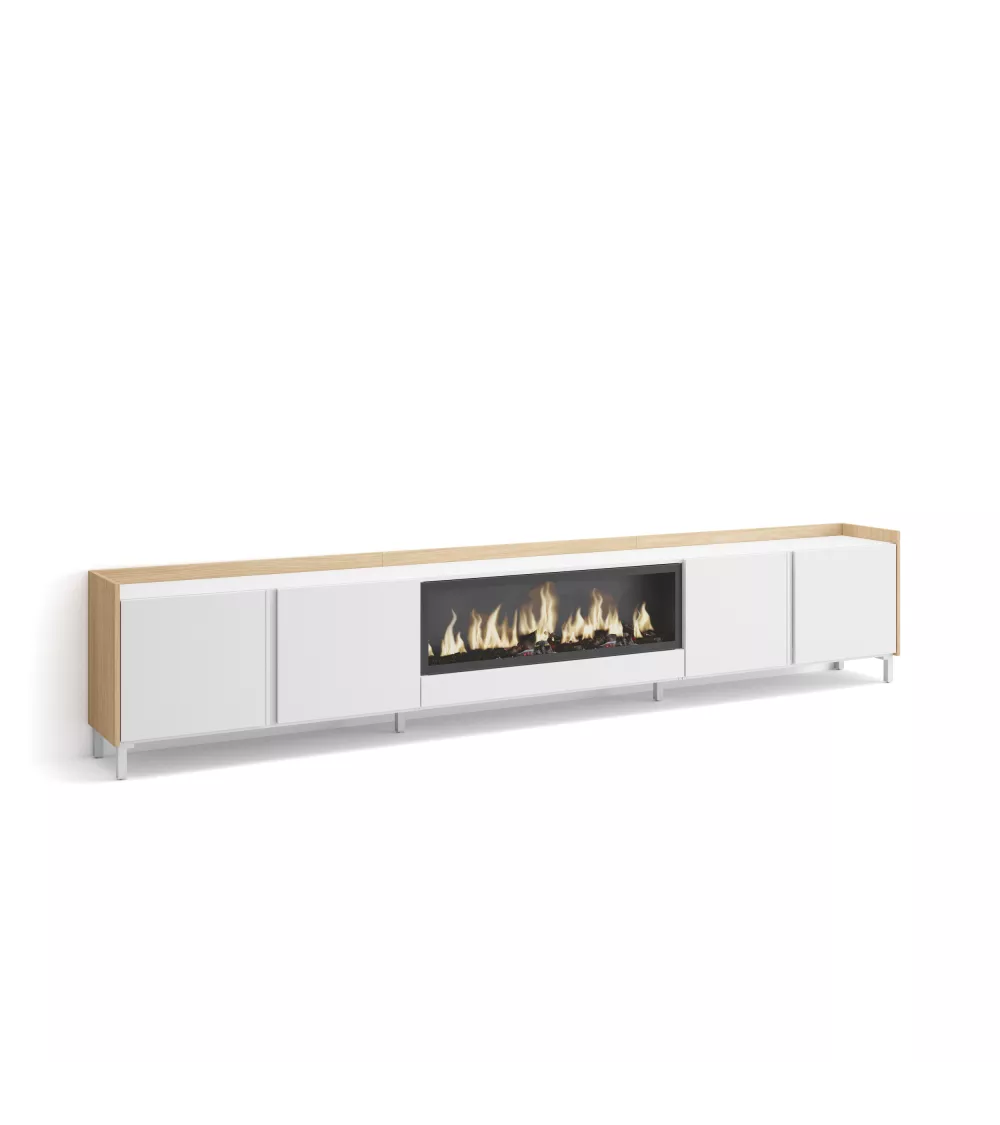 Skraut Home | Meuble TV | Banc Télé | Grand espace de Rangement | 315x61x35 cm | Pour les TV jusqu'à 80" | Cheminée électrique XXL | Design industriel | Style moderne | Blanc et Chêne Soft
