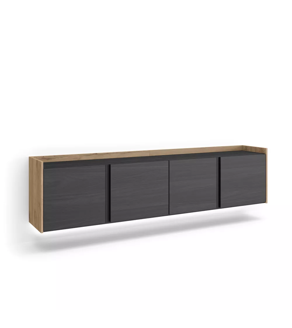Module TV avec portes battantes et grande capacité de rangement. Charnières avec fermeture soft. Poignées en aluminium. Dimensions du module : 103 cm de largeur, 50 cm de hauteur, 35 cm de profondeur. Couleur noir et chêne avec veinures en bois poreux de haute qualité. Interrupteur tactile caché. Lumière LED blanche neutre, avec variateur d'intensité.