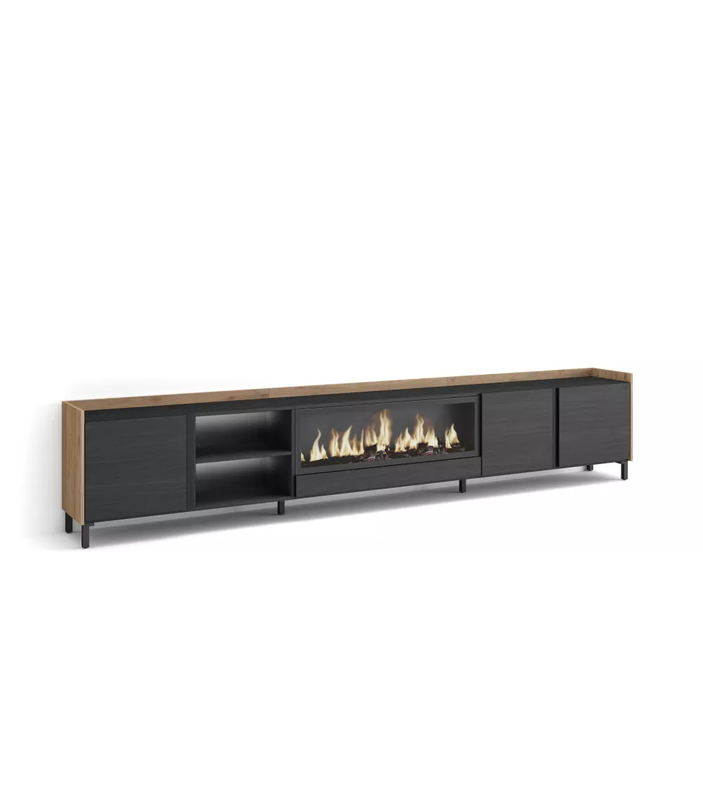Skraut Home | Meuble TV | Banc Télé | Grand espace de Rangement | 315x61x35 cm | Pour les TV jusqu'à 80" | Cheminée électrique XXL | Design industriel | LED | Style moderne | Noir et chêne