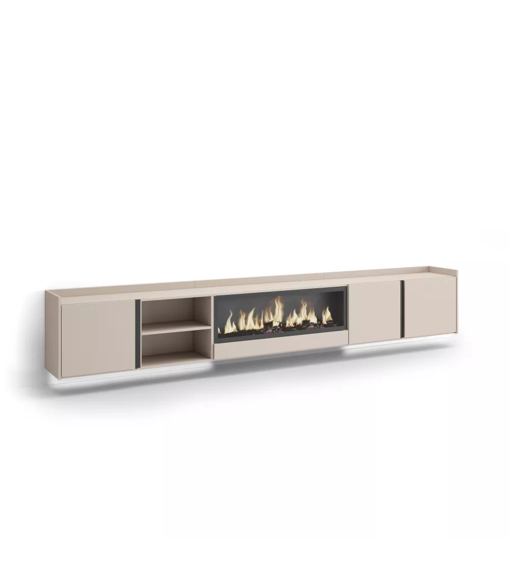 Skraut Home | Meuble TV | Banc Télé | Grand espace de Rangement | 315x50x35 cm | Pour les TV jusqu'à 80" | Cheminée électrique XXL | Suspendu, Mural | LED | Style moderne | Beige