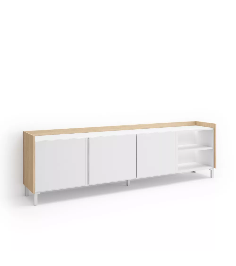 Interrupteur tactile caché. Lumière LED blanche neutre, avec variateur d'intensité. Module TV avec portes battantes et grande capacité de rangement. Charnières avec fermeture soft. Poignées en aluminium. Dimensions du module : 103 cm de largeur, 50 cm de hauteur, 35 cm de profondeur. Couleur blanc mat et chêne clair avec veinage bois au toucher poreux de haute qualité. Module TV avec espace de rangement pour vos appareils électroniques et porte rabattable. Charnières avec fermeture soft. Poignées en aluminium. Dimensions du module : 103 cm de largeur, 50 cm de hauteur, 35 cm de profondeur. Couleur blanc mat et chêne clair avec veinures en bois poreux de haute qualité. Pied de 10,5 cm réglable en hauteur. Couleur blanche.