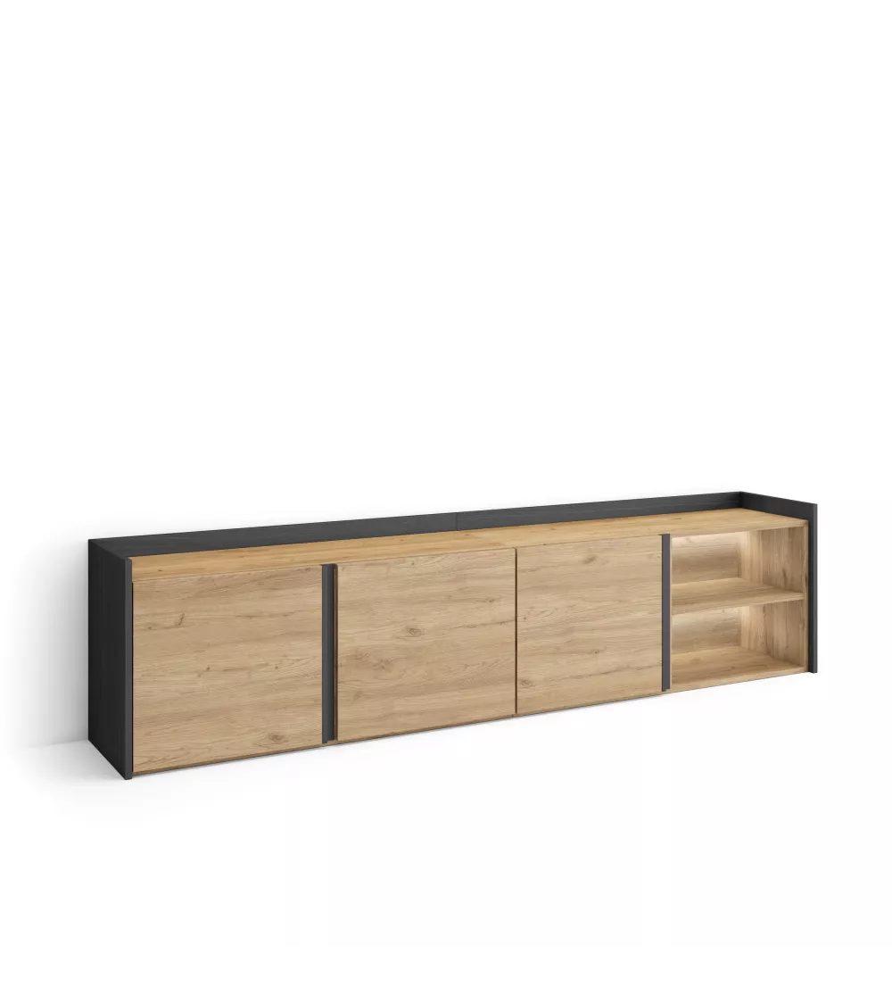 Skraut Home | Meuble TV | Banc Télé | Grand espace de Rangement | 207x50x35 cm | Pour les TV jusqu'à 80" | LED | Style moderne | Chêne et noir