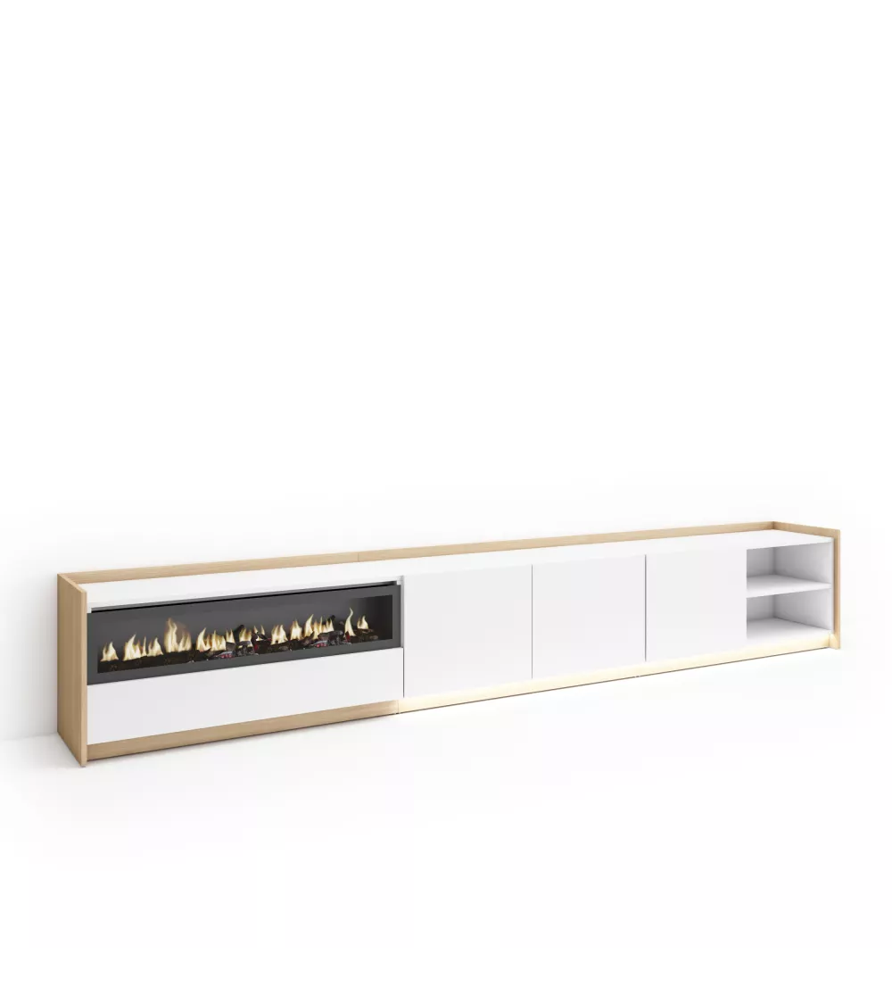 Skraut Home | Meuble TV | Banc Télé | Grand espace de Rangement | 310x50x37 cm | Pour les TV jusqu'à 80" | Cheminée électrique | LED | Style moderne | Blanc et Chêne Soft
